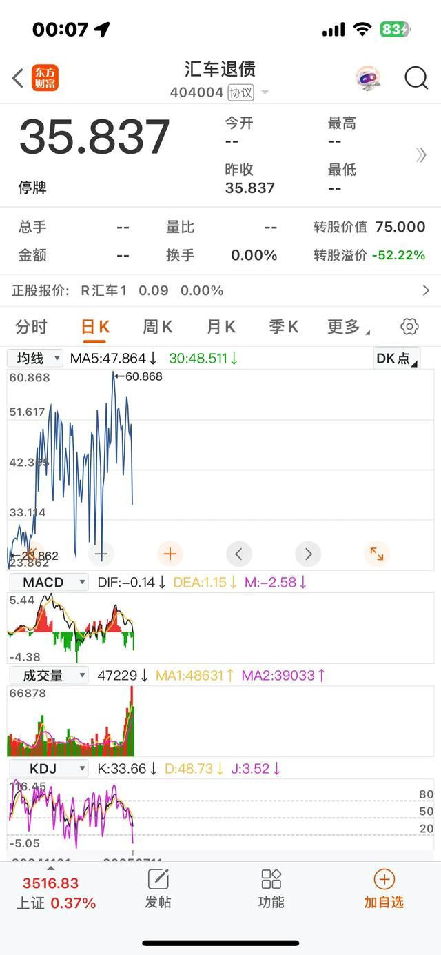 404004,挂牌转让价27.946,最高价60.868,最低23.862,最新35.837,转股溢价率-52.22%。