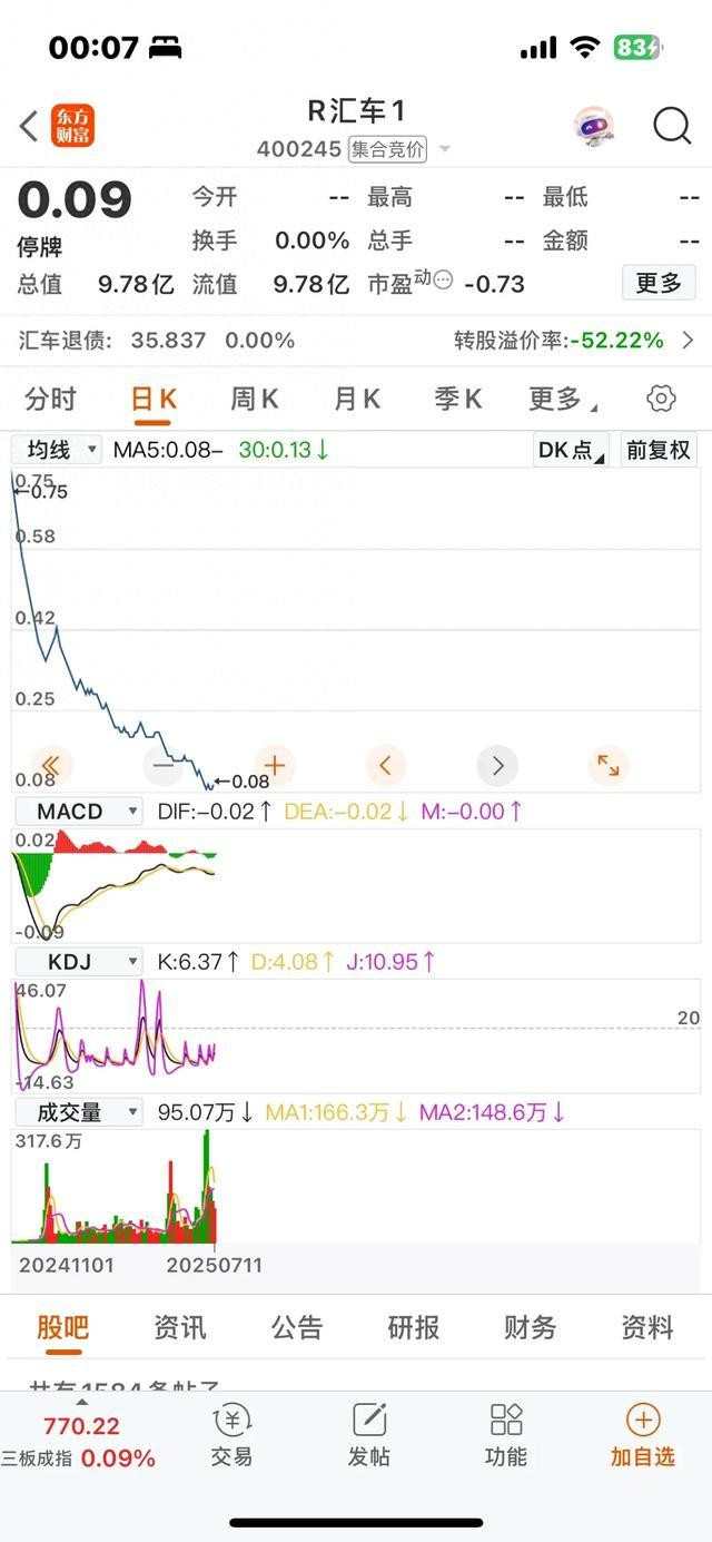 三板转让挂牌:2024-11-1,404004汇车退债,最新转让价35.837元,存量21.808亿元。400245 R汇车1,最新转让车价0.09元,股本108.67亿股